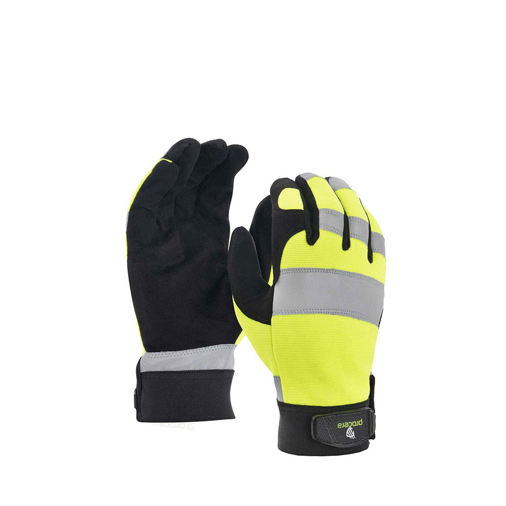 Rugalmas, élénk sárga spandex felsőrésszel és tartós műbőr tenyérrel készült munkakesztyű, több fényvisszaverő elemmel a jobb láthatóságért. A perforáció biztosítja a kéz szellőzését, a tépőzáras rögzítés pedig egyszerű fel- és levételt. Minden pár külön címkével érkezik.