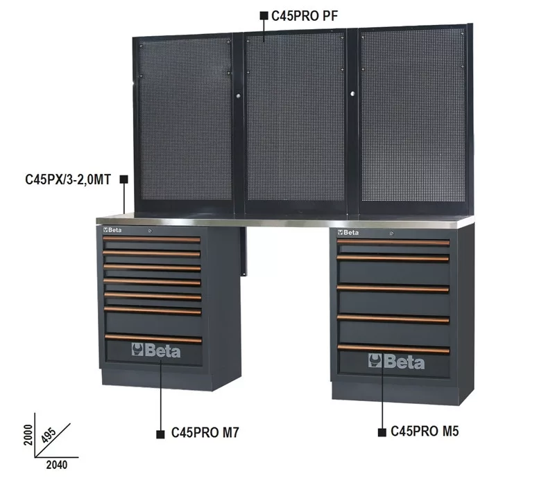 Az összeállítás a következőkből áll: • 1 db rozsdamentes acéllal fedett MDF munkalap, 2040 mm x 615 mm, (C45PRO 2.0 PXE/3-2.0MT) • 1 db 7 fiókos rögzített modul (C45PRO 2.0 M7) • 1 db 5 fiókos rögzített modul (C45PRO 2.0 M5) • 3 db perforált szerszámtartó panel (C45PRO 2.0 PF) • 2 db széles falikonzol (C45PRO 2.0 SL) • 2 db keskeny falikonzol (C45PRO 2.0 SS)