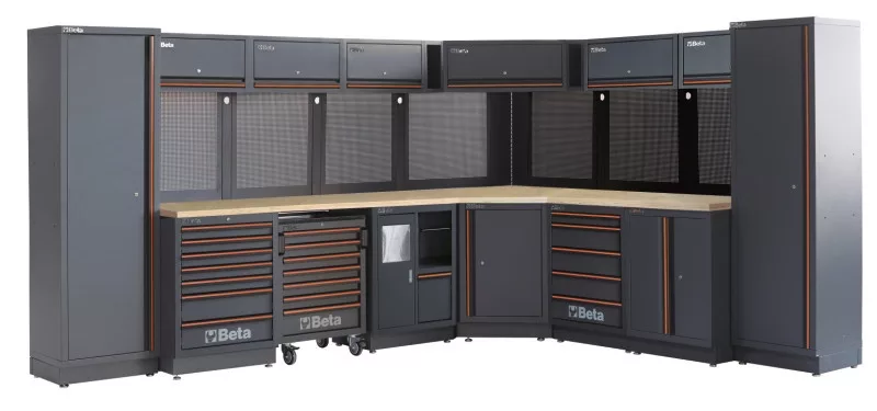 Az összeállítás a következőkből áll: • 1 db rétegelt fa munkalap, 2040 mm x 615 mm (C45PRO 2.0 PWE/3-2.0MT) • 1 db rétegelt fa munkalap, 1360 mm x 615 mm (C45PRO 2.0 PWE/2-1.3MT) • 1 db 7 fiókos rögzített modul (C45PRO 2.0 M7) • 1 db 7 fiókos szerszámkocsi (C45PRO 2.0 C7) • 1 db rögzített szerviz modul (C45PRO 2.0 MS) • 1 db 5 fiókos rögzített modul (C45PRO 2.0 M5) • 1 db rögzített, kétajtós modul (C45PRO 2.0 MA) • 1 db önálló teljes sarok rétegelt fa munkalappal(C45PRO 2.0 CORNER/W) • 5 db perforált szerszámtartó panel (C45PRO 2.0 PF) • 5 db faliszekrény (C45PRO 2.0 PM) • 7 db széles falikonzol (C45PRO 2.0 SL) • 2 db keskeny falikonzol (C45PRO 2.0 SS) • 2 db egyajtós szekrény (C45PRO 2.0 AS1)