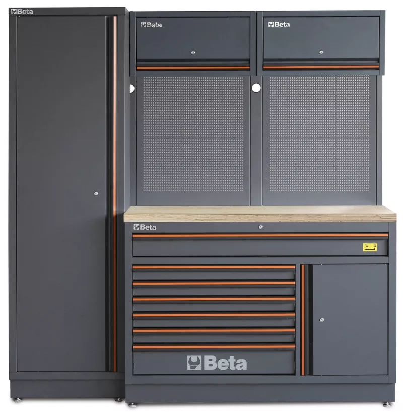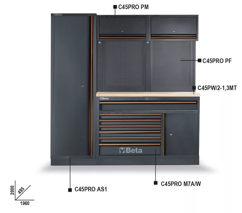 Az összeállítás a következőkből áll: • 2 db perforált szerszámtartó panel (C45PRO 2.0 PF) • 2 db faliszekrény (C45PRO 2.0 PM) • 2 db széles falikonzol (C45PRO 2.0 SL) • 1 db keskeny falikonzol (C45PRO 2.0 SS) • 1 db egyajtós szekrény (C45PRO 2.0 AS1): • 1 db 7 fiókos rögzített modul és rozsdamentes acéllal fedett MDF munkalap, 1360 mm x 615 mm (C45PRO 2.0 M7A/W): • 1 db fiók, 1248 mm x 406 mm • 6 db fiók, 782 mm x 406 mm • 5 db fiók, 65 mm magas • 1 db fiók, 145 mm magas • 1 db tárolórekesz köztes polccal és ajtóval