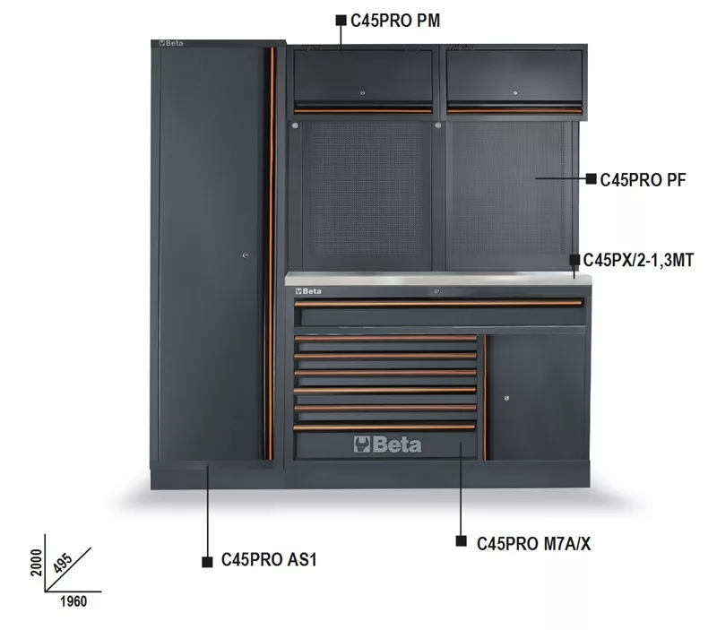 Az összeállítás a következőkből áll: • 2 db perforált szerszámtartó panel (C45PRO 2.0 PF) • 2 db faliszekrény (C45PRO 2.0 PM) • 2 db széles falikonzol (C45PRO 2.0 SL) • 1 db keskeny falikonzol (C45PRO 2.0 SS) • 1 db egyajtós szekrény (C45PRO 2.0 AS1) • 1 db 7 fiókos rögzített modul és rozsdamentes acéllal fedett MDF munkalap, 1360 mm x 615 mm (C45PRO 2.0 M7A/X): • 1 db fiók, 1248 mm x 406 mm • 6 db fiók, 782 mm x 406 mm • 5 db fiók, 65 mm magas • 1 db fiók, 145 mm magas • 1 db tárolórekesz köztes polccal és ajtóval