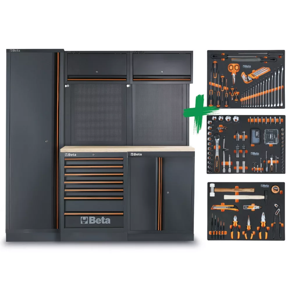 Kombináció, amely a következőkből áll: - Fix modul 7 fiókkal (C45PRO 2.0 M7) - Fix modul 2 ajtóval (C45PRO 2.0 MA) - 2 perforált szerszámtábla (C45PRO 2.0 PF) - 2 fali szekrény (C45PRO 2.0 PM) - 2 széles fali konzol (C45PRO 2.0 SL) - 1 keskeny fali konzol (C45PRO 2.0 SS) - 1 ajtós szekrény (C45PRO 2.0 AS1) Többrétegű fa munkafelület (C45PRO 2.0 PWE/2-1,3MT) 196 Beta Worker univerzálisan használható szerszámkészlettel, puha EVA tálcákban, 196 féle szerszámmal.