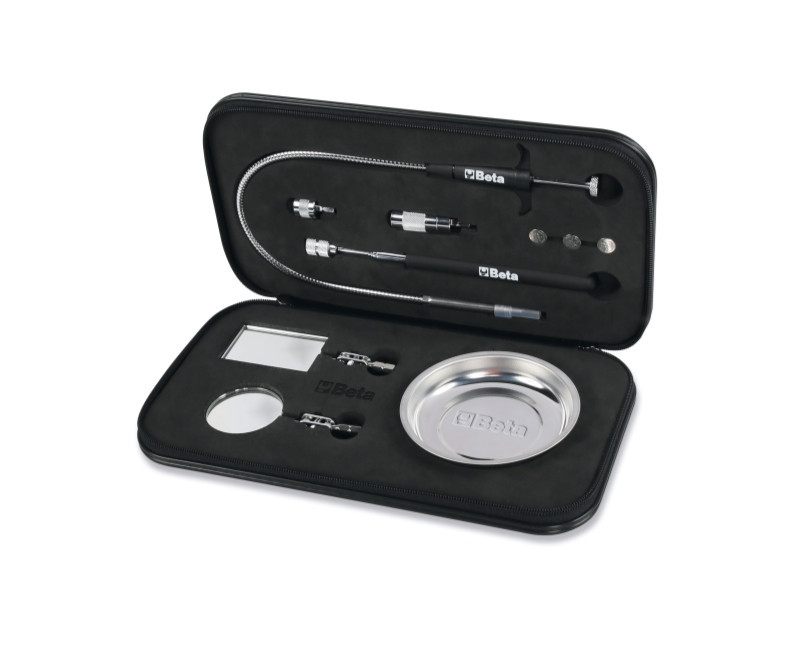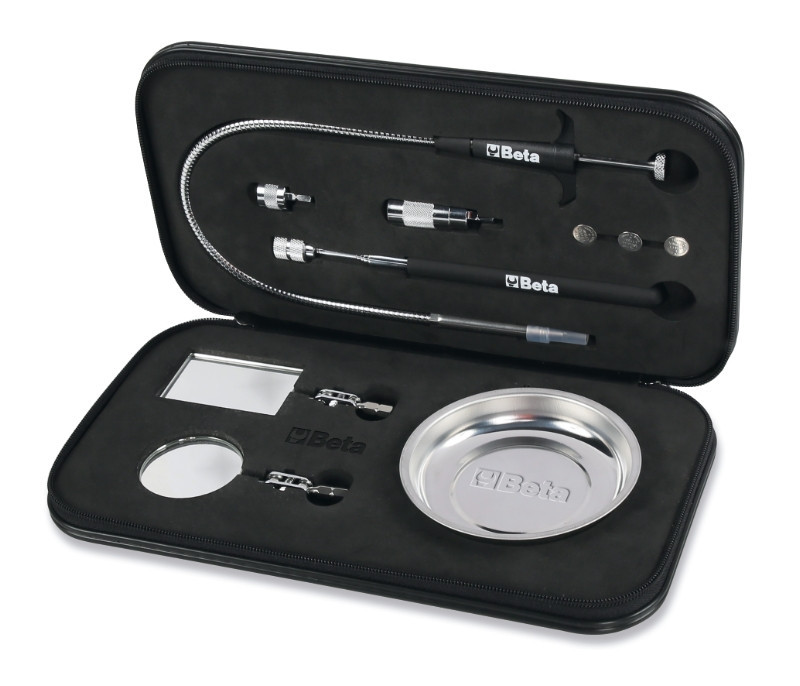 Készlet tartalma: • 1 db teleszkópos fogantyú (hossz: 185-660 mm) • 1 db négyszögletes vizsgálótükör, 65x43 mm • 1 db kerek vizsgálótükör, Ø 52 mm • 1 db mágnes, Ø 16,3 mm • 1 db ultrafényes LED lámpa • 1 db flexibilis csavarkiszedő (1713M termék) • 1 db mágneses, rozsdamentes acél tálca • 3 db LR44 gombelem ? 297x165x52 mm - ? 0,8 kg