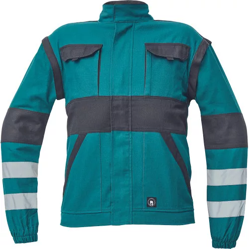 • férfi cipzáras munkakabát levehető újakkal • 2 első zseb • 2 mellzseb • megerősítés a váll és könyök részeken • rugalmas mandzsetta és alsó derékszegély • fényvisszavető csíkok az ujjakon és a kabát hátán, anyag: 100% pamut, anyagvastagság: 260 g/m2