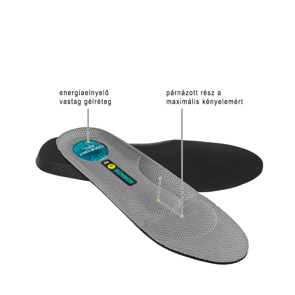 Anatómiai kialakítású gél talpbetét, a hosszanti és a haránt boltozat támogatására.
