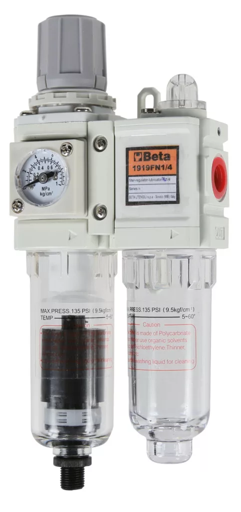 • Egy nedvesség leválasztóból és egy olajozóból áll • Az aggregát tartozékai: nyomáscsökkentő zárószerkezettel, levegő/olajkeverő olajszabályozóval, polikarbonát tartály félautomata nedvességleválasztó szeleppel, analóg manométer dupla mérőbeosztással (bar-psi) és tartókengyel