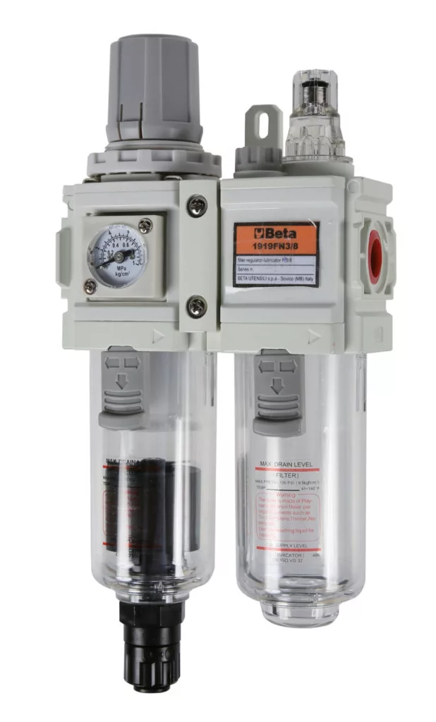 • Egy nedvesség leválasztóból és egy olajozóból áll • Az aggregát tartozékai: nyomáscsökkentő zárószerkezettel, levegő/olajkeverő olajszabályozóval, polikarbonát tartály félautomata nedvességleválasztó szeleppel, analóg manométer dupla mérőbeosztással (bar-psi) és tartókengyel