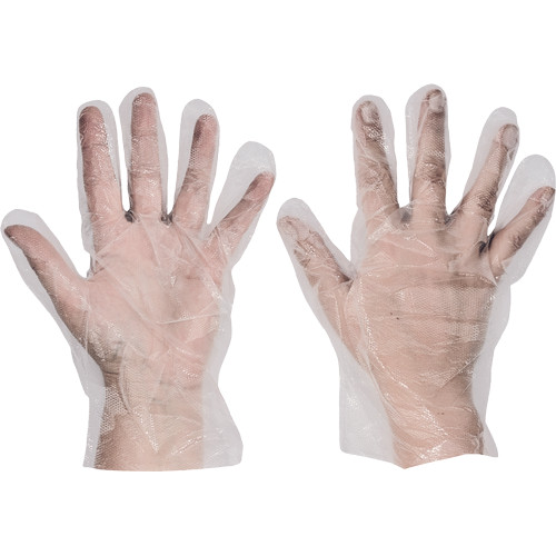 • élelmiszerekkel való rövid idejű érintkezésre alkalmas, 0,018 mm polietilén fóliából készült, egyszerhasználatos kesztyű