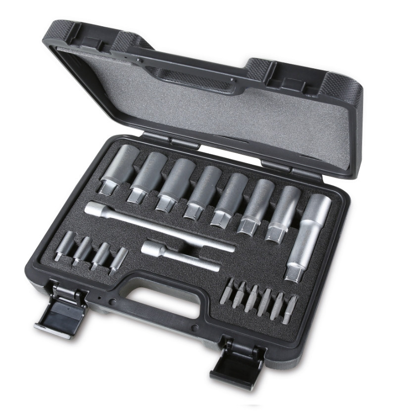 Készlet tartalma: • 7 hatlapú dugókulcs, méretek: 16 - 17 - 18 - 19 - 21 - 22 - 24 • 1 hosszabbító, hossz: 120 mm • 3 belső nyílású bit, méretek: 8x5 - 8x6 - 11x8 • 1 belső imbusz bit, méret: 10 mm • 1 XZN® bit, méret: M10 • 1 Torx® bit, méret: T50 • 4 imbusz bit, méret: 5- 6 - 7 - 8 • 1 bittartó hosszabbító, hossz: 95 mm • 1 bittartó hosszabbító, hossz: 190 mm ? 320x245x71 mm - ? 2,6 kg
