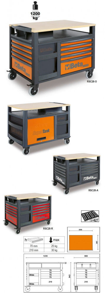 Fő jellemzők: • 10 teleszkópos, csapágyazott fiók (588x367 mm). • Gyors és biztos fióknyitás és zárás, a fiók elülső része nylon- és üvegszál. • 5 oldalsó fiók: 4 fiók, 70 mm magas 1 fiók 210 mm magas. • 5 fiók elöl: 4 fiók, 70 mm magas 1 fiók 210 mm magas. • A fiókok habgumival béleltek. • Négy Ø 150 mm kerék: 2 rögzített és 2 fékezhető forgókerék. • 2 központi biztonsági zár. • 3 szerszámos fiók elöl. • Rétegelt fa munkalap furatokkal a satu rögzítéséhez (A 1599F/150 satut külön kell megrendelni.) • Beépített szerszámos rekesz. • Zárható oldalrekesz bukóajtóval. • Beépített flakontartók. • 135 mm magas raktér műanyag borítással. • Statikus terhelhetőség: 1 200 kg