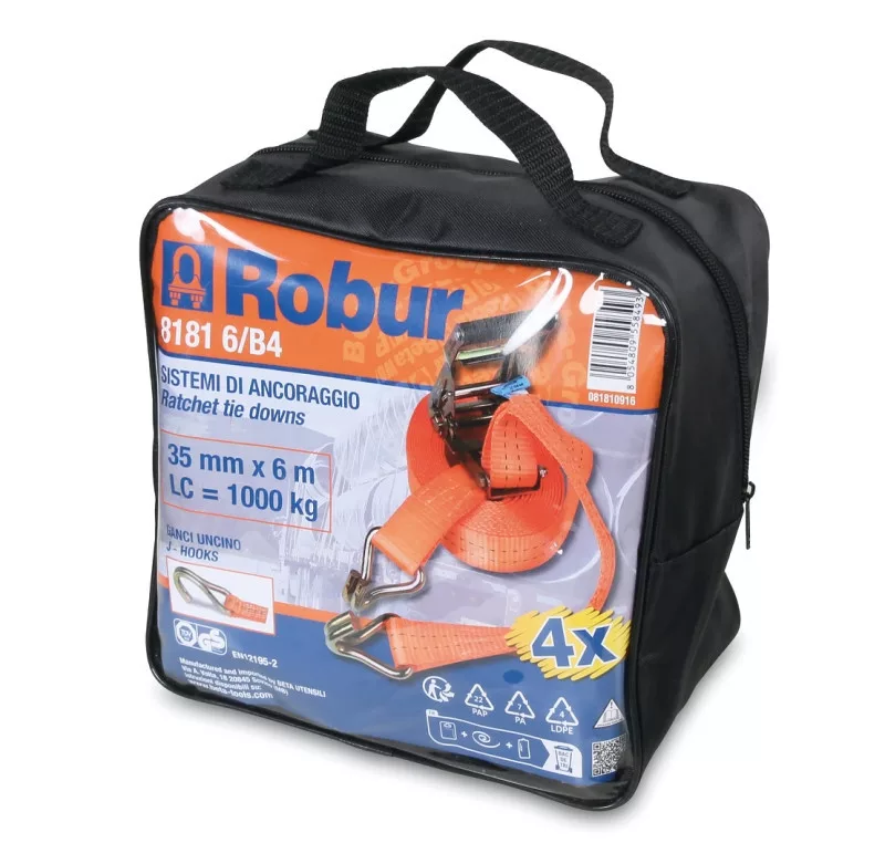 8181 6/B4 4 darab 8181 racsnis rögzítőheveder táskában, 6 m nagy szakítószilárdságú poliészter szalag, egyhorgos