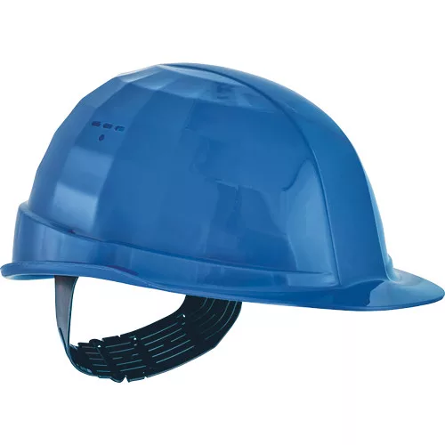 »Lockweiler PE kék védősisak szellőző kivitelben, 4 pontos textil hevederrel. A méret (52-62 cm) csúszó racsnival állítható. Hőmérséklet: -30°C-ig. Élettartam: 4 év. Súly: 310 g. Szabvány: EN 397.