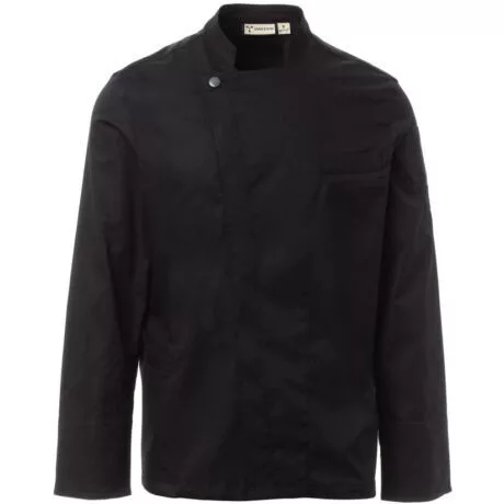 <ul><li>Szakácskabát mandarin gallérral, pamut twill és Lycra® T400® anyagból, kiváló rugalmas és légáteresztő tulajdonságokkal. Dupla soros záródás pattintható gombokkal. Hosszú ujjú felhajtható mandzsetta, félkör alakú hálós rész a karnyílás alatt, a légáteresztés érdekében. Ikonikus formájú folt a bal vállon, tónusos hímzéssel, tollzsebbel kiegészítve. Mellkaszseb és praktikus okostelefon zseb a derekán. Függőleges hasítékok a hát alsó részén a mozgás megkönnyítése érdekében.</li><li>58% pamut, 42% elastomultiester, 160 g/m<sup>2</sup></li><li>Méret: S-5XL</li></ul>