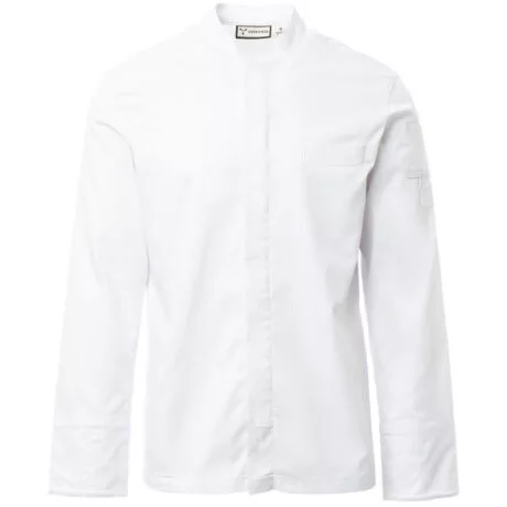 <ul><li>Szakácskabát mandarin gallérral, pamut twill és Lycra® T400® anyagból, kiváló rugalmas és légáteresztő tulajdonságokkal. Záródás középen, pattintható gombokkal. Hosszú ujjú, felhajtható mandzsetta, félkör alakú hálós rész a karnyílás alatt, a légáteresztés érdekében. Ikonikus formájú folt a bal vállon, tónusos hímzéssel, tollzsebbel kiegészítve. Mellkaszseb és praktikus okostelefon zseb a derekán. Függőleges hasítékok a hát alsó részén a mozgás megkönnyítése érdekében.</li><li>58% pamut, 42% elastomultiester, 160 g/m<sup>2</sup></li><li>Méret: S-5XL</li></ul>