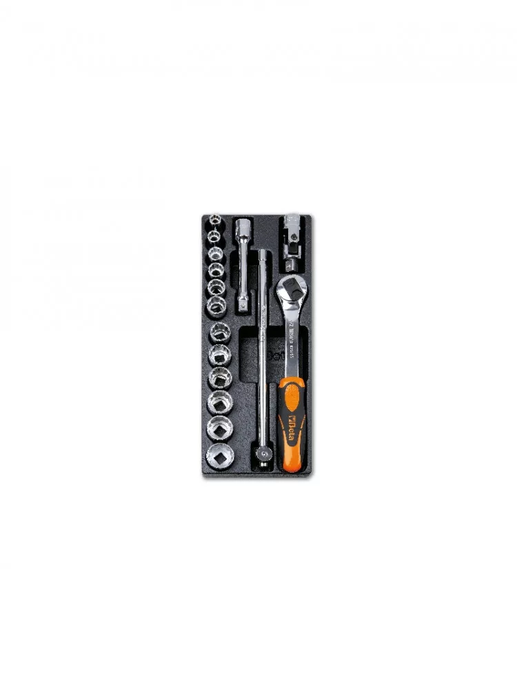 kemény hőformált műanyag tálca szerszámkészlettel 920AS1/2” - os tizenkétszögű dugókulcs 3/8-7/16-1/2-9/16-5/8-11/16-3/4-13/16-7/8-15/16-1-1.1/16 920/211/2"-os toldó 125 mm 920/251/2"-os csukló 920/421/2"-os csúszkás T-hajtószár 305 mm 920/551/2"-os irányváltós racsn