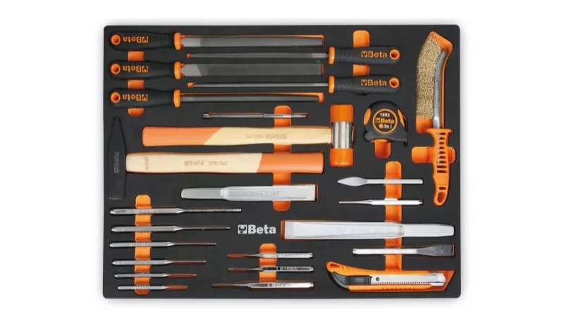 EVA habszivacs tálca beütő szerszámokkal, reszelőkkel, vágószerszámokkal és mérőeszközzel