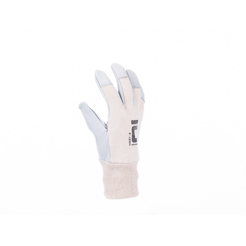 • kesztyű bárány színbőr tenyérrel • pamutszövet kézfejjel, megerősített ujjhegyekkel és kötött mandzsettával