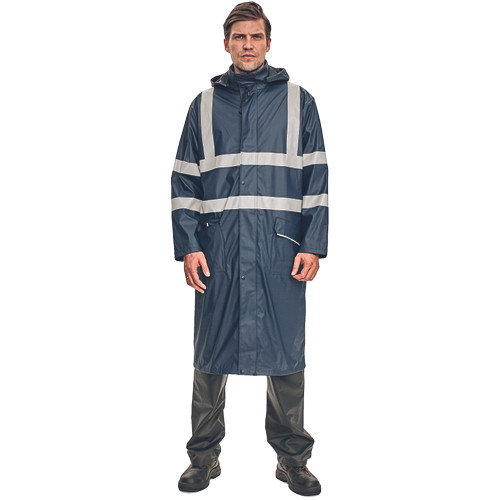 • víz-és szélálló, bő szabású esőköpeny gallérba hajtott kapucnival • hossza: 120 cm • húzózsinórral állítható kapucnival • 2 mély zsebfedős oldalzseb • patenttal szűkíthető mandzsetták • fényvisszavető csíkok az ujjakon, a vállakon és a test körül