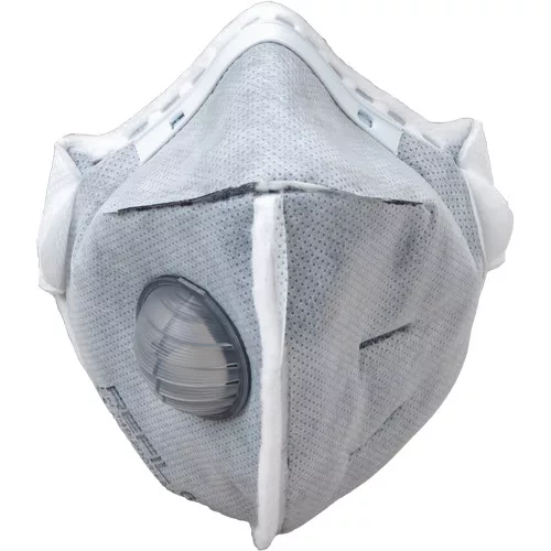 » összehajtható FFP2 NR szűrőfélálarc kilégző szeleppel és aktívszén réteggel a megengedett koncentrációk 12-szereséig szilárd és folyékony aeroszolok esetében, gőzök és gázok ellen legfeljebb az MK értékig