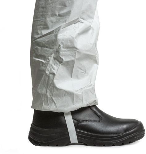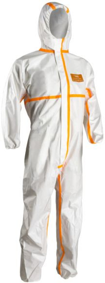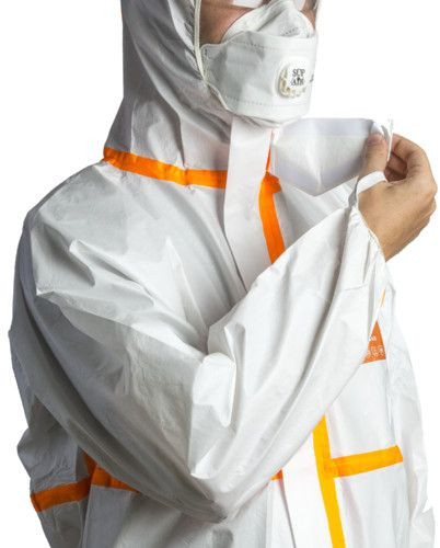 * fehér színű, mikroporózus filmréteggel bevont, 65 g/m2 vastag, szilikon mentes polipropilén overál 3 részes kapucnival