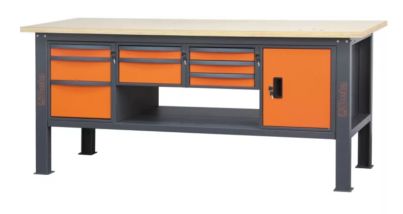 C58BC-W2,1 8CA/O Fa munkalapos munkapad, 2,1 m széles, 8 fiókkal és ajtós modullal