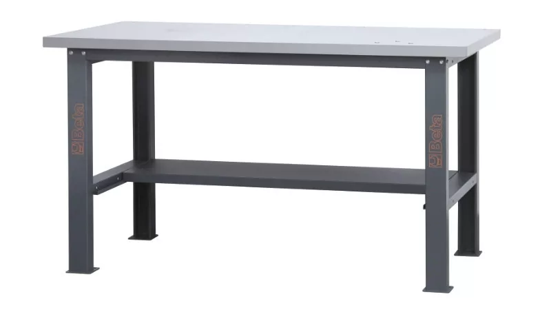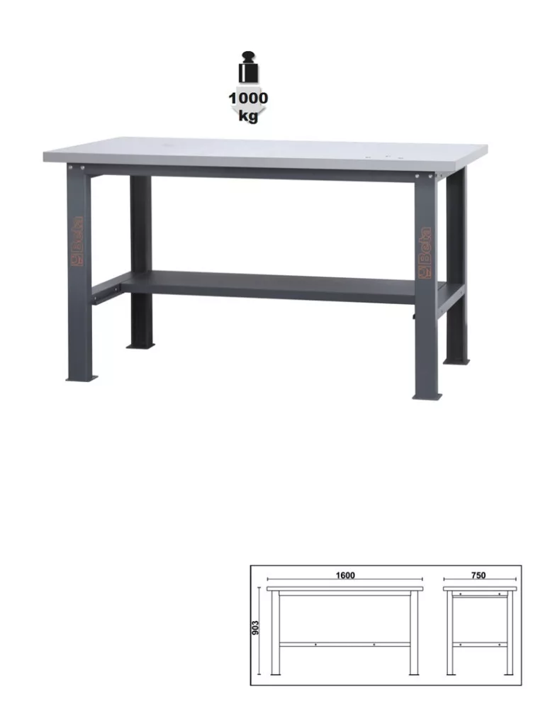 Fő jellemzők: • Rozsdamentes acéllal fedett MDF munkalap (1600 mm x 750 mm), 38 mm vastag • Acélszerkezet 4 tartólábbal • Furatokkal a satu rögzítéséhez (1599F/150 - 1599GI/150, a satu külön rendelhető) • Alsó keskeny tárolópolc, 1288 mm x 335 mm; vastagság: 40 mm • Padlóhoz rögzíthető • Statikus terhelhetőség: 1000 kg, egyenletesen elosztva A következő kiegészítőkkel bővíthető: • Perforált oldalpanel, C58PFL • Legurulásgátló perem, 1600 mm, C58BAC 1.6 1.600x750x904 mm