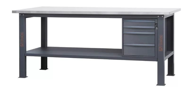 C58BC-X2,1 4CA/A Rozsdamentes acéllal fedett MDF munkalapos munkapad, 2,1 m széles, 4 fiókkal és ajtós modullal