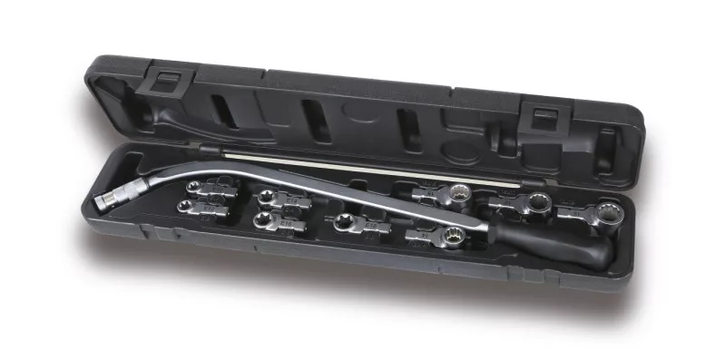 1 sarokcsillagkulcs betéttartóval 4 dupla tizenkétszögű betét: 12x14 - 13x15 - 16x17 - 18x19 mm 5 betét Torx®-csavarokhoz: E10 - E12 - E14 - E16 - E18 ? 530x110x55 mm
