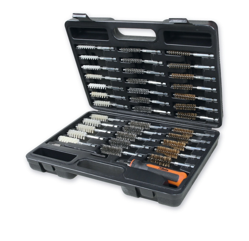 Készlet tartalma: • 12 nylon kefe, 8÷19 mm (1 mm sörtetávolság) • 12 acél kefe, 8÷19 mm (1 mm sörtetávolság) • 12 sárgaréz kefe, 8÷19 mm (1 mm sörtetávolság) • 1 betéttartó mágneses gyorscsatlakozóval • 1 hosszabbító mágneses gyorscsatlakozóval