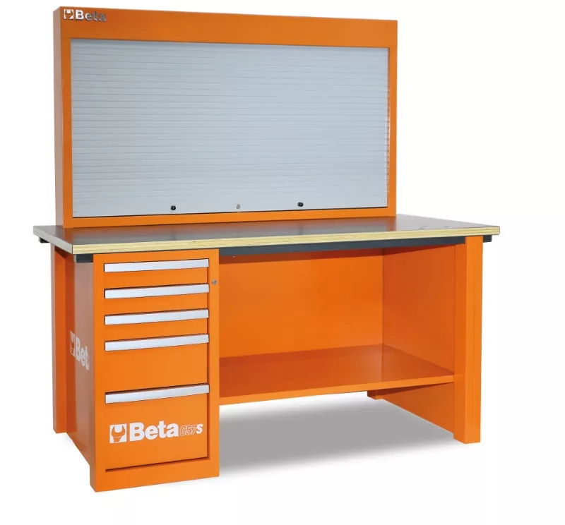 • Ez a modell szerszámtartó fallal (C57P) és egy fiókos blokkal készült. A fiókos blokk: 5 fiók teleszkópos és csapágyazott 588x367 mm 3 fiók 90 mm 1 fiók 180 mm 1 fiók 280 mm. A fiókokban hőformált tálcák Központi zár Szerszámtartó fal furattal, hogy a falra is lehessen szerelni. Alumíniumredőny, függőlegesen manőverezhető, biztonsági zárral. Három kivehető perforált szerszámtartó lemez Multiplex munkalap, laminált rétegelt, három furattal, 1599F/150 satu rögzítéséhez_x005F_x000D_. (külön kell megrendelni) • Ez a modell szerszámtartó fallal (C57P) és egy fiókos blokkal készült.