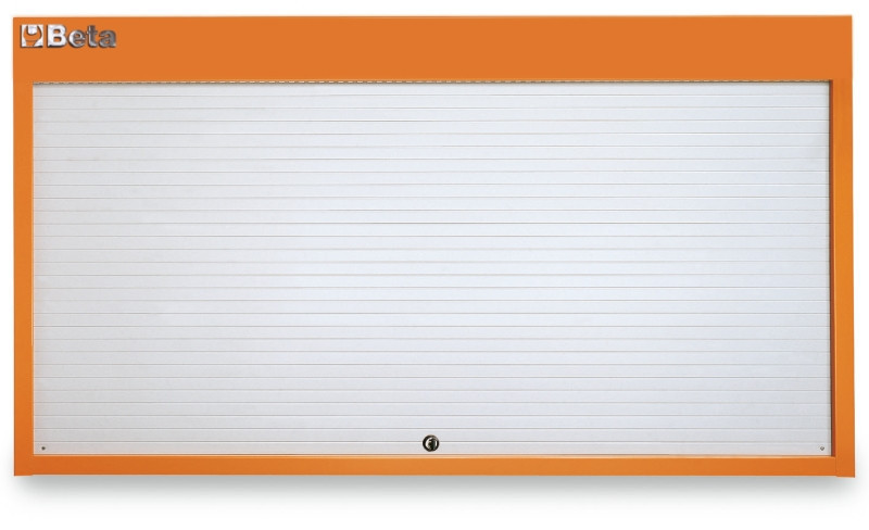 Szerszámtartó fal hátulján két furattal, hogy falra is lehessen szerelni. Biztonsági zárral ellátott alumínium redőny, három kivehető perforált szerszámtartó lemez