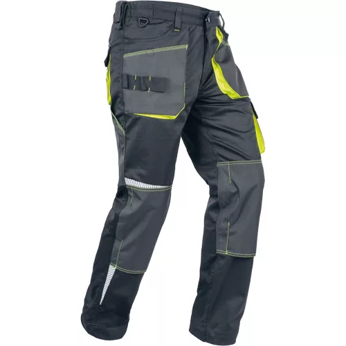 • férfi munkanadrág, rendkívül tartós rugalmas anyagból • elasztikus derékkal • multifunkcionális zsebek • Oxford 600D megerősített térdzsebek térdvédők behelyezéséhez • nyomtatott szegmensekre bontott fényvisszavető részletek • állítható szárhossz