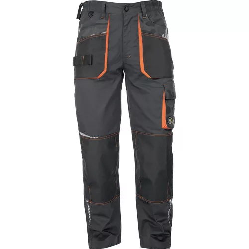 • férfi munkanadrág, rendkívül tartós rugalmas anyagból • elasztikus derékkal • multifunkcionális zsebek • Oxford 600D megerősített térdzsebek térdvédők behelyezéséhez • nyomtatott szegmensekre bontott fényvisszavető részletek • állítható szárhossz