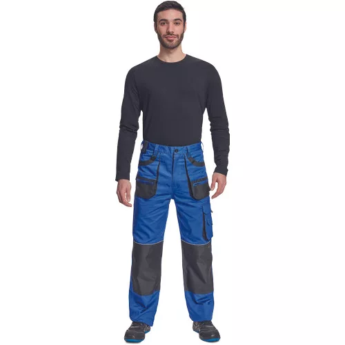• férfi munkanadrág • 6 multifunkciós zseb • OXFORD poliészter erősítésekkel az igénybevett részeken • térdvédő behelyezésére alkalmas, megerősített térdrész • leengedhető szárak • anyaga 100% pamut, 235g/m2
