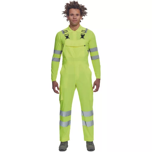 • férfi Hi-Vis mellesnadrág 7 cm széles fényvisszavető csíkokkal • rugalmas betét a hátsó részen • 2 oldalsó zseb + 1 érmezseb • 2 oldalzseb • 1 multifunkcionális mellzseb • rugalmas pántok műanyag csatokkal • meghosszabbítható szárhossz