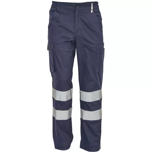 • férfi munkanadrág 7 cm széles fényvisszavető csíkokkal • 2 oldalsó zseb + 1 érmezseb • 2 oldalzseb • 2 hátsó zseb • rugalmas oldalsó betétek a derékon • meghosszabbítható szárhossz • 65% PES/35% pamut, 195 g/m2