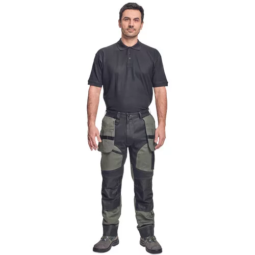 • férfi munkanadrág rugalmas derékkal • 2 oldalsó zseb, két szerszámtartó zsebbel elöl • D-gyűrű • 1 oldalsó zseb a lábon hajtókával • 1 oldalsó zseb cipzárral • 2 hátsó hajtókás zseb • megerősített térdrész, térdvédőtartó • 5 cm-rel meghosszabbítható nadrágszárak • a nadrág hátsó, alsó része megerősített • dekoratív varratok • 265 g/m2