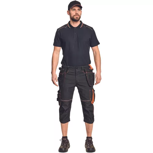 • férfi 3/4-es munkanadrág rugalmas derékkal • 2 oldalsó zseb, 2 repülőzseb, 2 szerszámtartó hurok • 2 oldalzseb a lábon, 1 átlátszó zseb igazolvány számára, D- gyűrű • 2 hátsó zseb • kalapácstartó kontrasztos színben • megerősített térdrész, térdvédőtartó • dekoratív, figyelemfelkeltő varrás színes cérnával