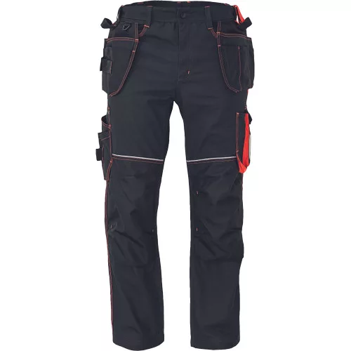 • férfi munkanadrág rugalmas derékkal • 2 oldalsó zseb, 2 repülőzseb szerszámtartó hurokkal, 1 átlátszó zseb az igazolvány számára, D-gyűrű • 2 hátsózseb • kalapácstartó kontrasztos színben • megerősített térdrész, térdvédőtartó • 5 cm-rel meghosszabbítható nadrágszárak • a nadrágszár hátsó, alsó része megerősített • dekoratív, figyelemfelkeltő varrás színes cérnával