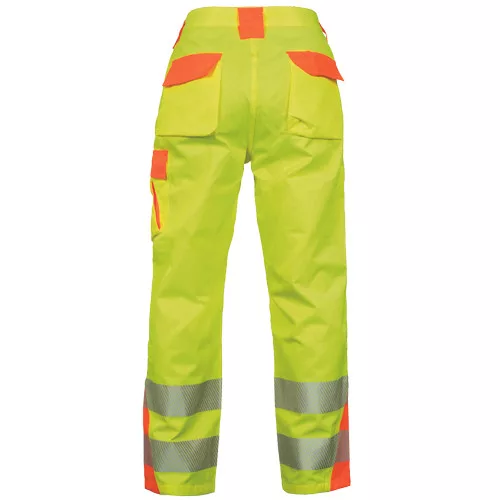 • férfi nadrág két attraktív jólláthatósági szín kombinációjában fényvisszavető csíkkal • 2 nagy első zsebbel • 2 multifunkcionális oldalzseb • 2 hátsó zsebfedős zsebbel • rugalmas derékpánt • kalapácstartó