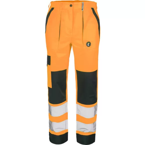 • női HI-VIS munkanadrág rugalmas derékrésszel • 2 oldalzseb • 1 combzseb • 2 hátulsó zseb tépőzárral • 2 bevarrt, 7,5 cm széles fényvisszavető csík a lábszáron • megerősített térdrész • hosszabbítható szárhossz