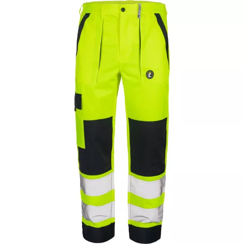 • Férfi HI-VIS munkanadrág rugalmas derékrésszel • 2 oldalzseb • 1 combzseb • 2 hátulsó zseb tépőzárral • 2 bevarrt, 7,5 cm széles fényvisszavető csík a lábszáron • megerősített térdrész • hosszabbítható szárhossz