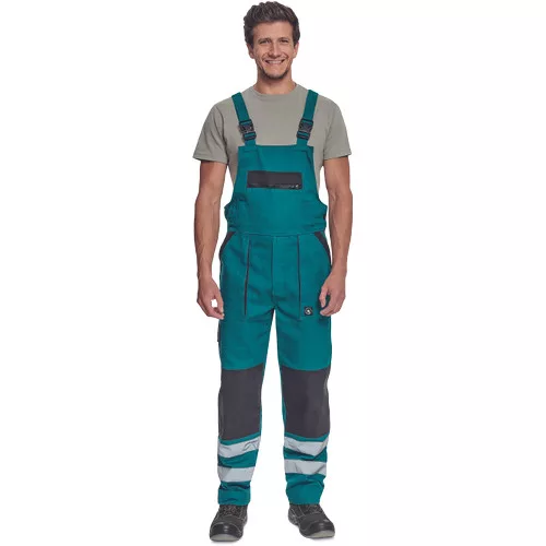 • férfi mellesnadrág rugalmas derékkal, széles pántokkal, műanyag csatokkal • 2 első zseb, 1 oldalzseb, 1 nagy mellzseb, 2 hátsó zseb • megerősített térdrész» fényvisszavető csíkok a szárak alsó részén» leengedhető szárak • anyag: 100% pamut, anyagvastagság: 260 g/m2