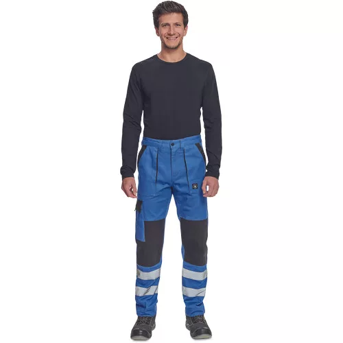 • férfi munkanadrág rugalmas derékkal • 2 első zseb • 1 oldalzseb • 2 hátsó zseb • megerősített térdrész • fényvisszavető csíkok a nadrág alján • a szárak hossza meghosszabbítható • anyag: 100% pamut, anyagvastagság: 260 g/m2