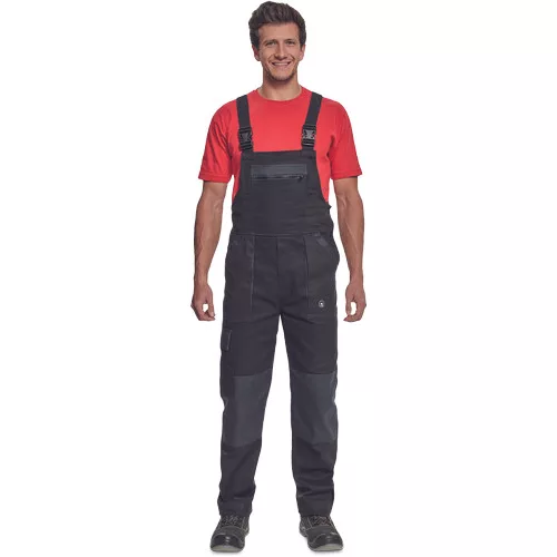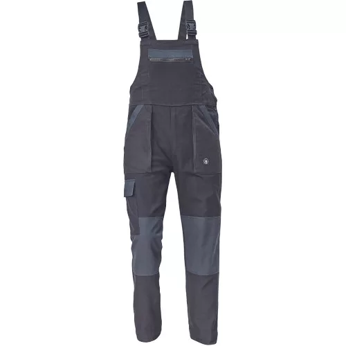 • férfi mellesnadrág rugalmas derékkal, széles pántokkal, műanyag csatokkal • 2 első zseb, 1 oldalzseb, 1 nagy mellzseb, 2 hátsó zseb • megerősített térdrész • leengedhető szárak