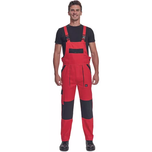 • férfi mellesnadrág rugalmas derékkal, széles pántokkal, műanyag csatokkal • 2 első zseb, 1 oldalzseb, 1 nagy mellzseb, 2 hátsó zseb • megerősített térdrész • leengedhető szárak