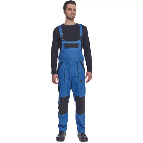• férfi mellesnadrág rugalmas derékkal, széles pántokkal, műanyag csatokkal • 2 első zseb, 1 oldalzseb, 1 nagy mellzseb, 2 hátsó zseb • megerősített térdrész • leengedhető szárak