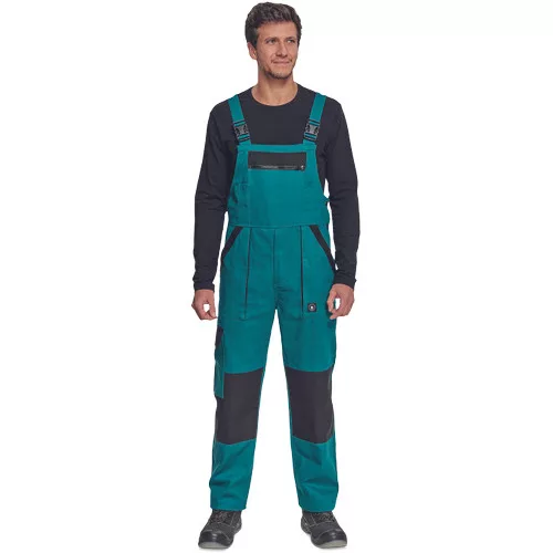 • férfi mellesnadrág rugalmas derékkal, széles pántokkal, műanyag csatokkal • 2 első zseb, 1 oldalzseb, 1 nagy mellzseb, 2 hátsó zseb • megerősített térdrész • leengedhető szárak