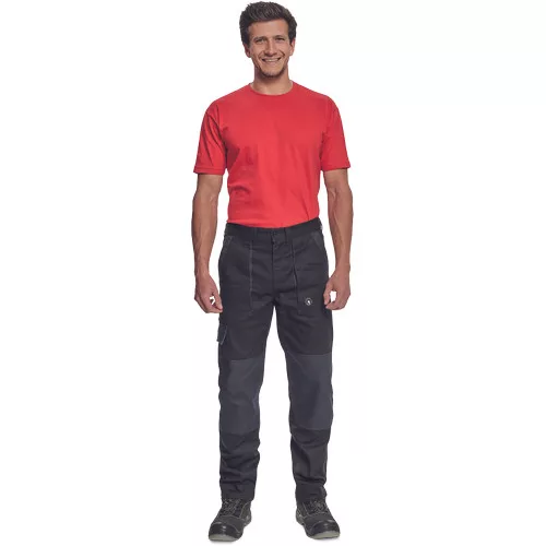 • férfi munkanadrág rugalmas derékkal • 2 első zseb, 1 oldalzseb, 2 hátsó zseb • megerősített térdrész • leengedhető szárak