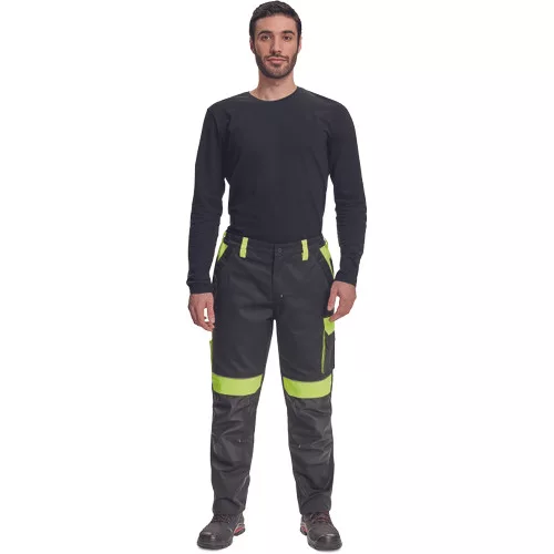 • férfi munkanadrág rugalmas derékkal • 2 első zseb, 1 dupla oldalzseb a bal száron • 2 hátsó zseb • 2 kis hátsó zseb a jobb száron • fényvisszavető szegés • Oxford 600D megerősített térdrész, térdvédőtartó • leengedhető szárak